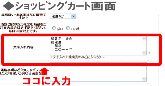 ショッピングカートの画面で「還暦祝い」「お誕生日」など各種贈物の選択ができます。