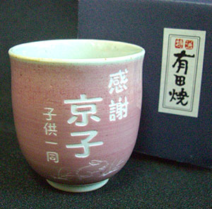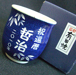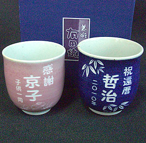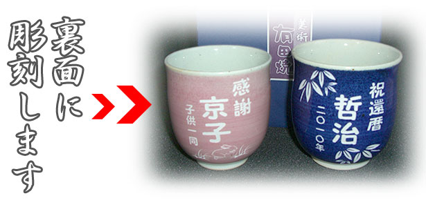 「有田焼 湯のみ」に彫刻で文字が入れられます♪文字入れパターンも豊富にご用意いたしております!還暦祝い以外にもお誕生日や長寿のお祝いなど贈り物・プレゼント・ギフトに最適です