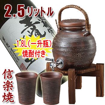 信楽焼 焼酎サーバー 手付きサーバー2.5L 超得セット(焼酎カップ2個・焼杉木台付)