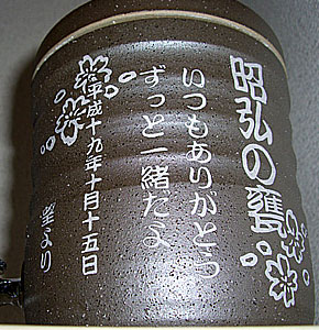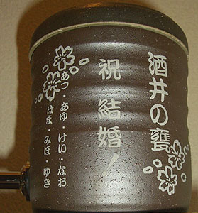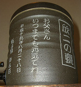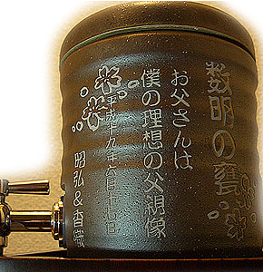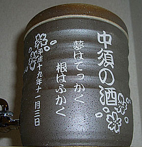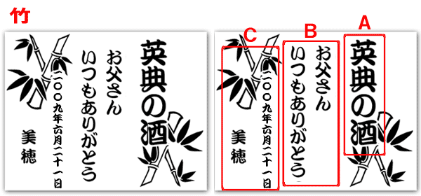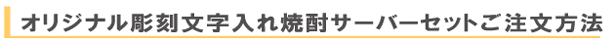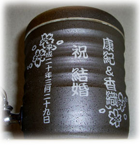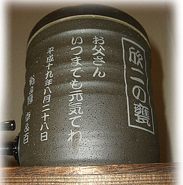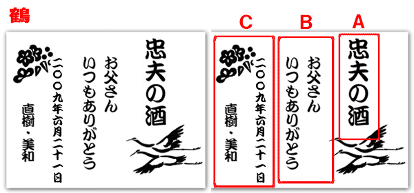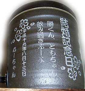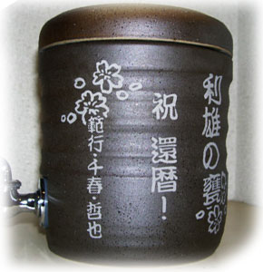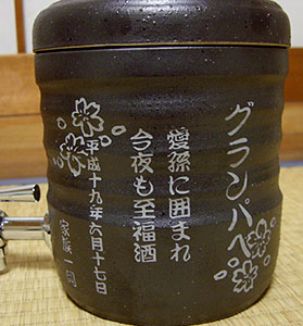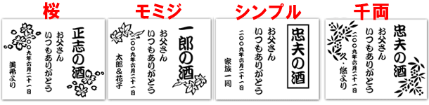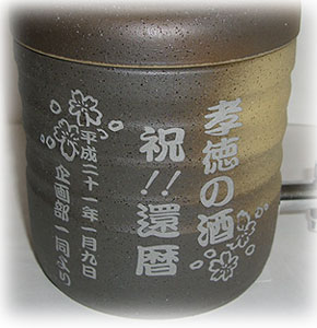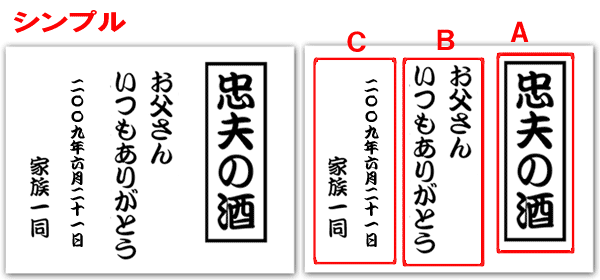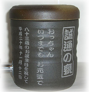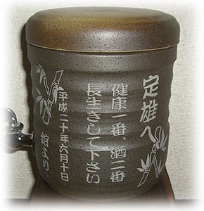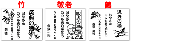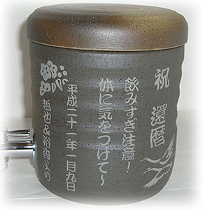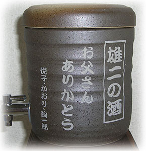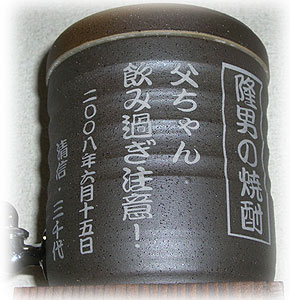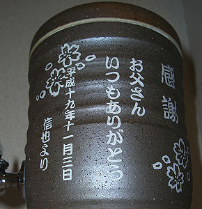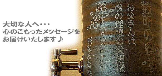 @7種類の文字入れパターンの中から、どれか1つを選び 押して下さい Aショッピングカートの画面が開きますので、”レジ画面”に行くのボタンを 押してください。 Bお客様のお名前・住所・お届け先の内容を入力し、一番下にある 文字入れ内容記入欄に【例】のように記載してください。 【例:】 A:三郎の酒(5文字までお好きな文字が入れられます) B:お父さん(8文字までお好きな文字が入れられます) いつもありがとう(8文字までお好きな文字が入れらます) C:平成二十三年六月十九日(日付の変更は可能です。) 娘より(6文字までお好きな文字が入れられます) C”確認する”のボタンを押して注文内容を確認したら”注文する”のボタンを押す。 ・FAXで具体的な文字入れ内容のご注文ができます。 ![]() ![]() インターネットの操作方法が分らない方、ご注文内容、配送日についてご不明な方など、お気軽にご連絡くださいませ。 |