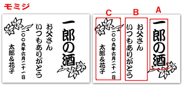 | ◆文字数について A:5文字までお好きな文字が入れられます B:8文字2行までお好きな文字が入れられます。(8文字で改行) C:10文字を超えると年、月日で改行する場合がございます。 お好きな日付と名前が入れられます。名前は6文字まで ※複雑な漢字は彫刻できない場合がございます。 その場合はご連絡いたします。 |