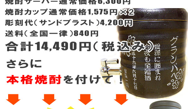 @7種類の文字入れパターンの中から、どれか1つを選び 押して下さい Aショッピングカートの画面が開きますので、”レジ画面”に行くのボタンを 押してください。 Bお客様のお名前・住所・お届け先の内容を入力し、一番下にある 文字入れ内容記入欄に【例】のように記載してください。 【例:】 A:三郎の酒(5文字までお好きな文字が入れられます) B:お父さん(8文字までお好きな文字が入れられます) いつもありがとう(8文字までお好きな文字が入れらます) C:平成二十三年六月十九日(日付の変更は可能です。) 娘より(6文字までお好きな文字が入れられます) C”確認する”のボタンを押して注文内容を確認したら”注文する”のボタンを押す。 ・FAXで具体的な文字入れ内容のご注文ができます。 ![]() ![]() インターネットの操作方法が分らない方、ご注文内容、配送日についてご不明な方など、お気軽にご連絡くださいませ。 | ||||||||||||||||||||||||||||||||||||||||||||||||||||||||||||||||||||||||||